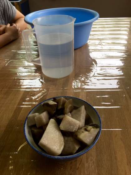 コンニャク作りがはじまります。一番下の写真の芋がコンニャクの原材料です。