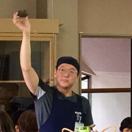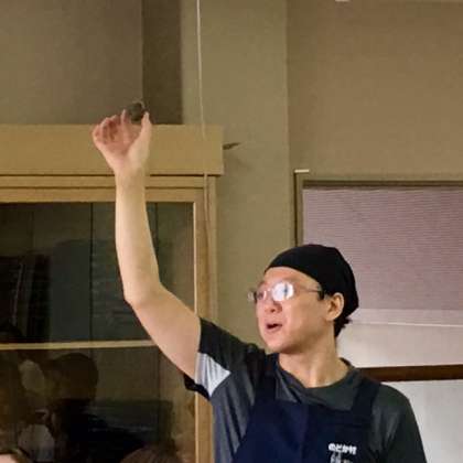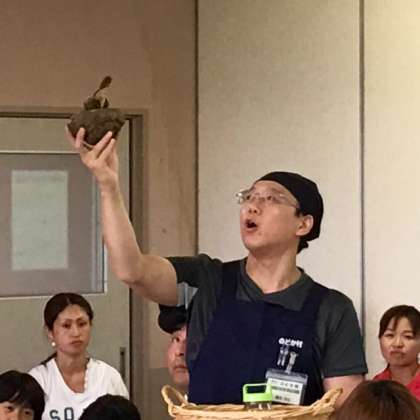 コンニャクのりがまとまるまでの時間を利用して、コンニャク芋についてお話を聞いています。