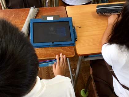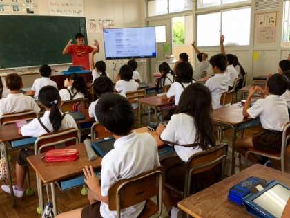 4年1組の授業の様子です。大型ディスプレイやタブレットパソコンを使って何の授業か?と参観していると図工の時間でした。