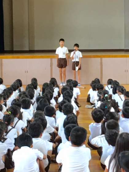 月曜日の朝は「児童朝会」です。運営委員会の皆さんが、登校時間に門に立ち「あいさつ運動」がはじまりました。児童朝会では、運営委員会の代表が前に出て「あいさつをしましょう」と話をしてくれました。