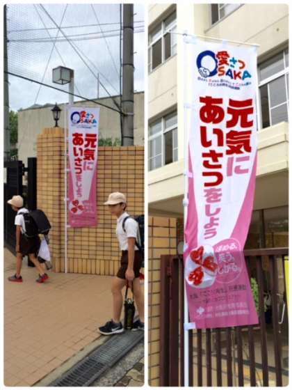正門と通用門に「元気にあいさつをしよう」ののぼりが上がりました。