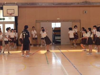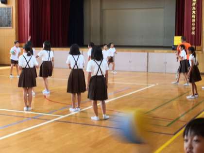 今回は6年生が講堂を使っています。大縄跳びやドッジボール、バスケットボールを楽しんでいます。