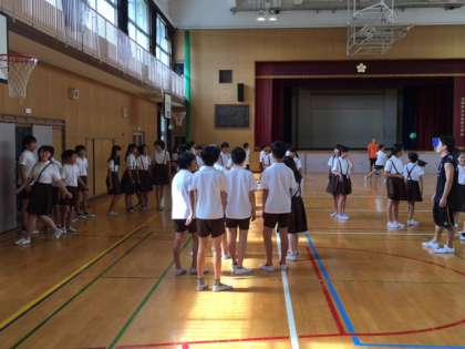 今日は交通安全指導のため、午前中は運動場が使用出来ません。2学期より雨の日や運動場の使えない日には、学年ごとに講堂を開放してクラス遊びを推進しています。