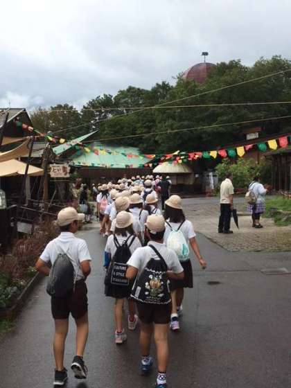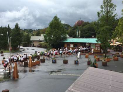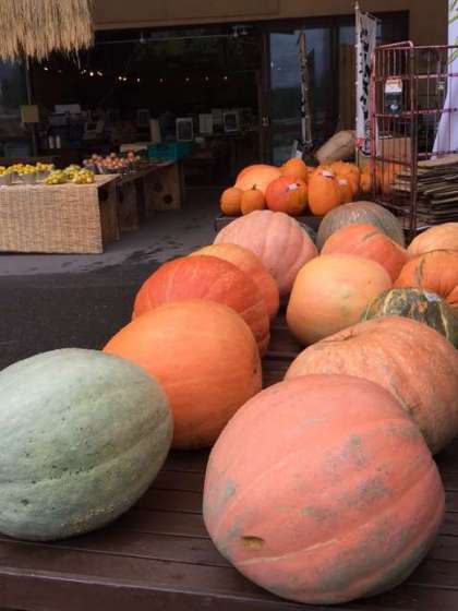 モクモク手作りファームのゲートに到着です。大きなカボチャを見てびっくり!!時折日差しもさしています。