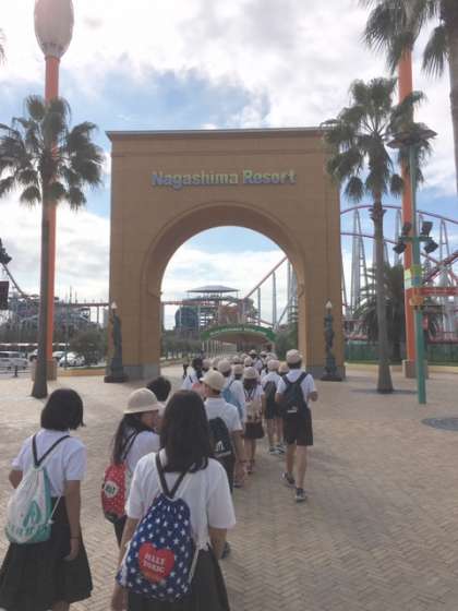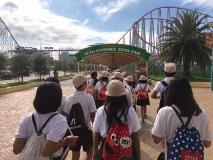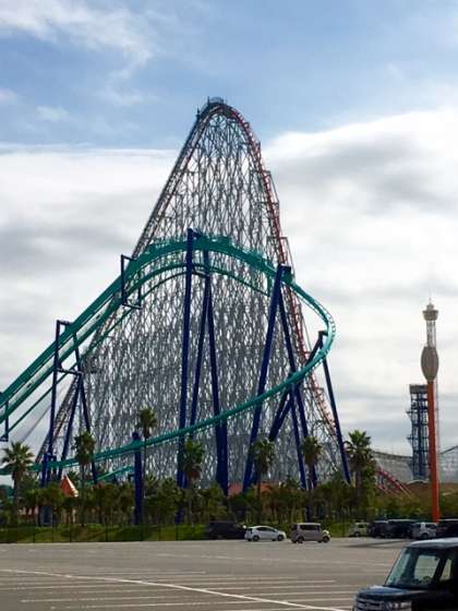 入場ゲートに向かっています。子どもたちは試運転しているコースターに目が釘付けです。