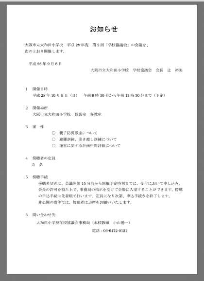 10月9日に平成28年度 第二回学校協議会を開催します。傍聴希望の方は、ホームページまたは大和田小学校校門の掲示をごらんくださいますようお願いいたします。なお、傍聴者は先着5名様となります。問合せは大和田小学校学校協議会事務局までお電話お願いします。