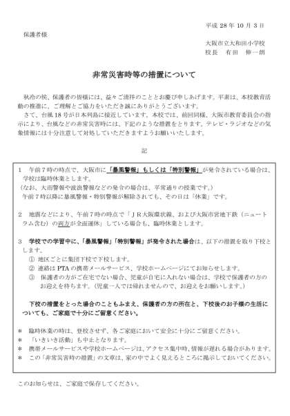 本日「非常災害時の措置について」のお手紙をお子様を通じて配付しました。ご確認ください。なお、文書は大和田小学校ホームページにも掲載しています。学校日記右側「配布文書」▼非常災害時の措置についてでごらんいただけます。