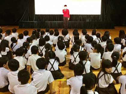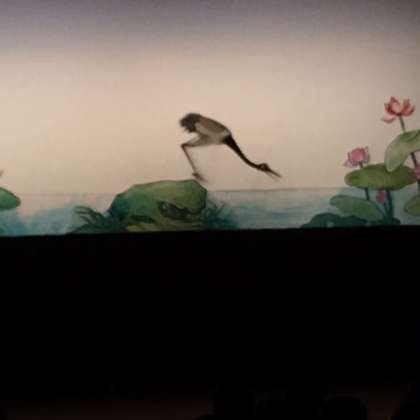 1〜3年生の観劇会がはじまりました。影絵劇(皮影戯 ヒーインシー)は中国1200年の歴史を持つ影絵だそうです。最初は「鶴と亀」です。カラフルな影絵に子どもたちは釘づけです。