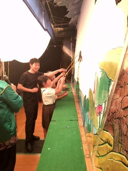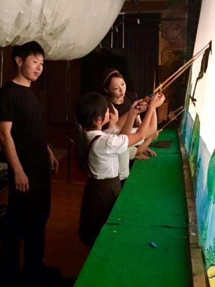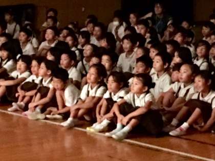 子どもたちの代表が影絵に挑戦しています。会場の友だちからは大きな拍手が寄せられました。