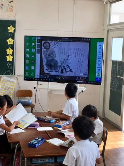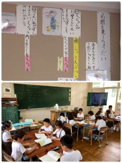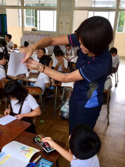 2年2組の図工の時間です。国語で学習した「名前を見てちょうだい」を題材にペープサートを作っています。