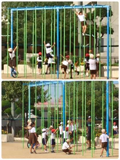 登り棒では、一年生の子どもが高くまで登っています。
