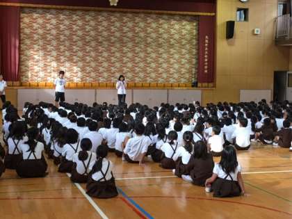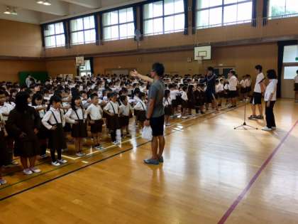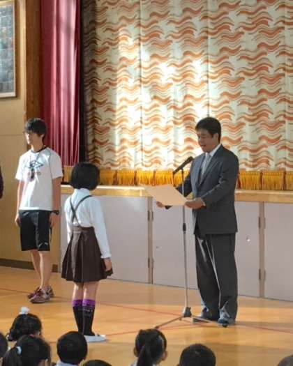 雨はすっかり上がったのですが、運動場の状態があまり良くなかったので講堂で児童朝会を行いました。