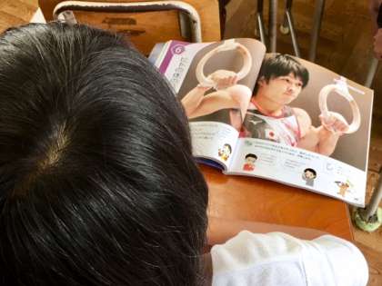 4年1組の子どもたちは総合の時間、オリンピックで活躍した内村航平選手を学んでいます。担任の石倉先生からは個人総合優勝した6種目についてお話を聞いていました。