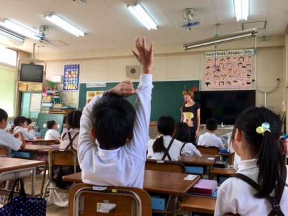 「給食室を探検しよう」の題材で、なぜエプロンをするのでしょう?と岡山先生が子どもたちに問いかけると、一斉に手があがりました。