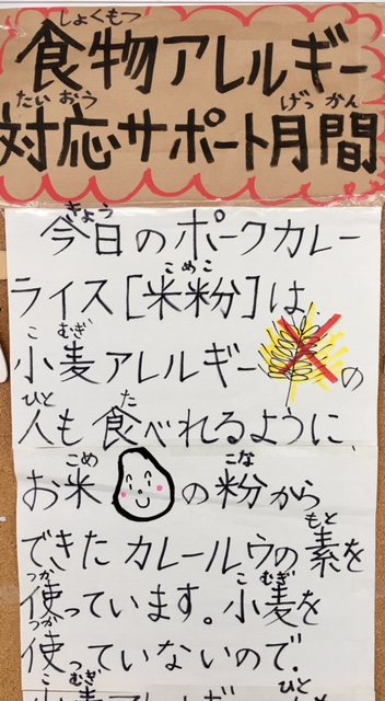今日は「食物アレルギー対応サポート月間」のメニューです。小麦アレルギーのある人も安心していただけます。みんなで楽しく給食をいただきましょう。