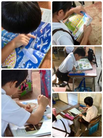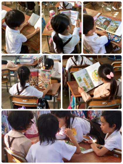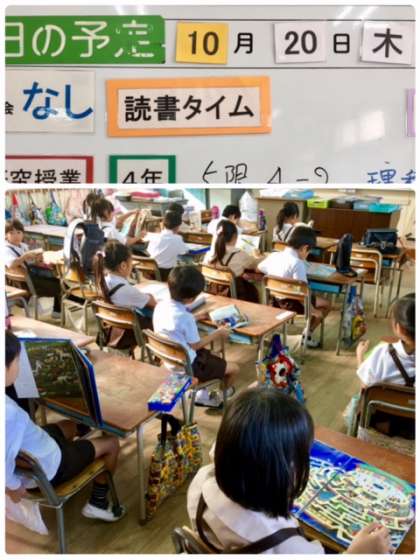 1年1組の読書タイムです。子どもたちがそれぞれ本を選んで読んでいます。中には一冊の本を友だちと読んでいる姿も見られます。