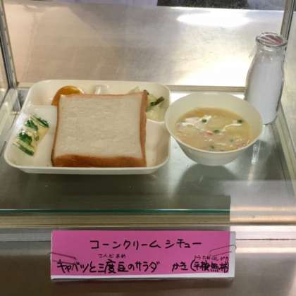 今日の献立は、コーンクリームシチュー、キャベツと三度豆のサラダ、食パン、柿、牛乳です。