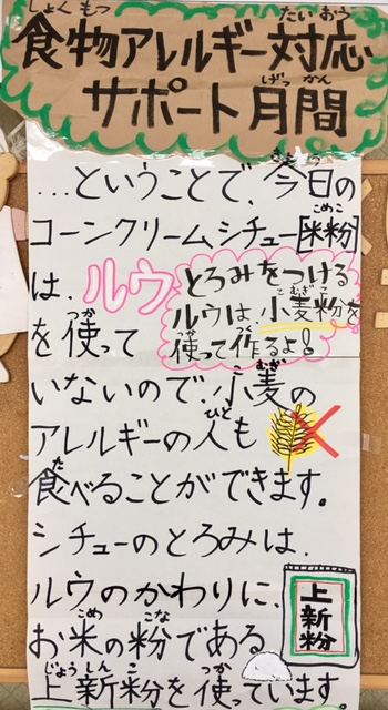 明日は、全校たてわり遠足です。気候が良くなってきたので明日が楽しみです。給食室からいい匂いがしてきました。今月は食物アレルギー対応サポート月間です。小麦アレルギーの人も安心してみんなと給食が食べられます。