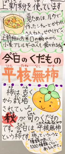 柿は旬を迎え美味しい季節となりました。学校給食は季節を感じられるところが良いですね。いただきます。