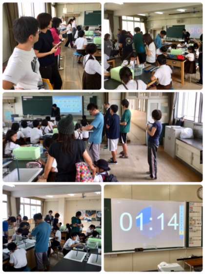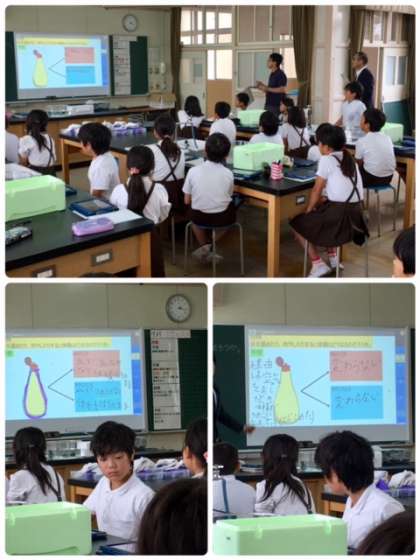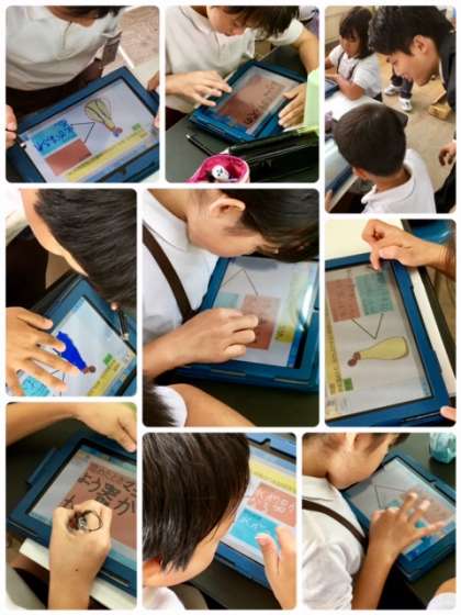 前時の実験をビデオで確認して、それぞれがものの温度と体積の関係について予想をたて、タブレットパソコンで書きます。言葉や図を書いて発表します。