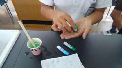 6時間目はクラブ活動です。科学クラブは、今日は『スライムスーパーボール』づくりをしています。