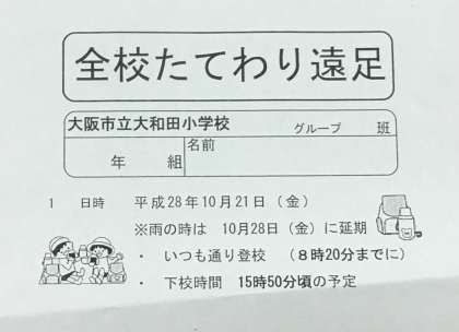 児童のみなさん!明日は全校たてわり遠足ですね。いつもより少し早く登校します。遅れないで登校しましょう。「早ね・早おき・朝ごはん」それとおトイレを忘れないで登校しましょう。