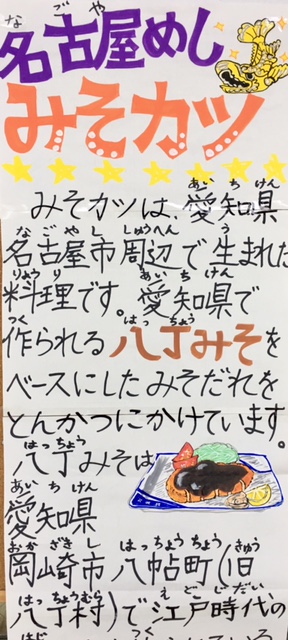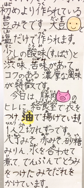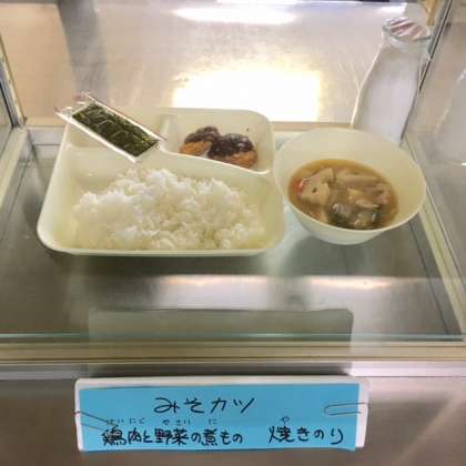 今日の献立は、味噌カツ、鶏肉と野菜の煮物、焼き海苔、ごはん、牛乳です。