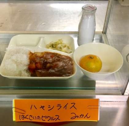 今日の献立は、ハヤシライス、白菜のピクルス、みかん、牛乳です。