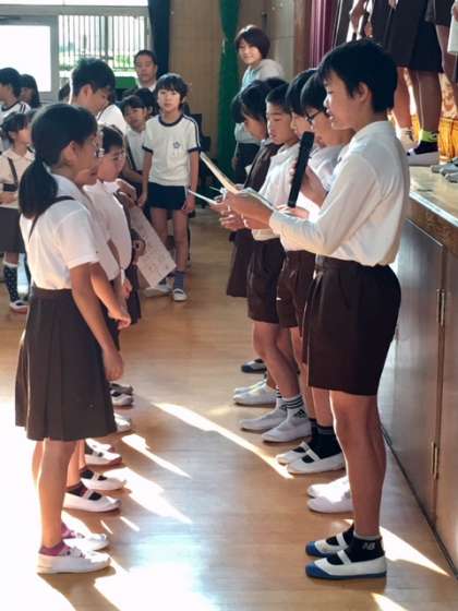 最初に、運営委員会の活動について話してくれました。運営委員会の皆さんは、たてわり遠足や運動会など学校行事のめあてを考えたり、ポスターを作って学校行事を盛り上げてくれています。また、学校行事の司会・運営をしています。