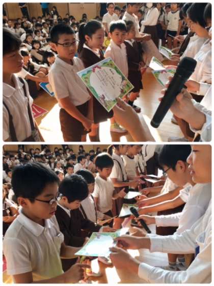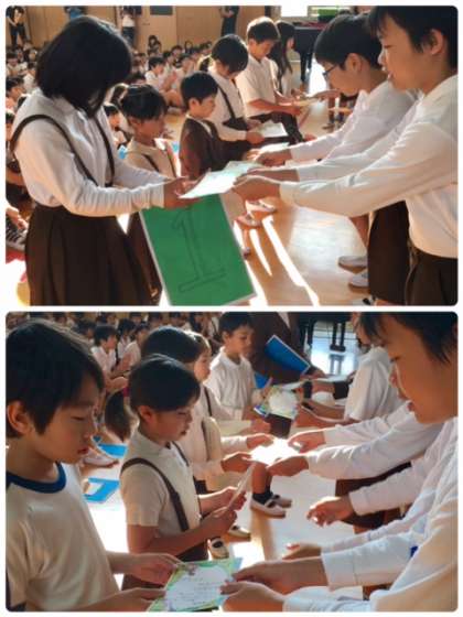 先週の金曜日に行われた、全校たてわり遠足のオリエンテーリングの表彰が行われました。