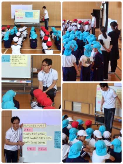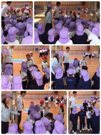 今日は、光の園幼稚園の子どもたちを迎えて「幼・小交流学習」を行っています。1年1組・2組の子どもたちと体育の学習をします。