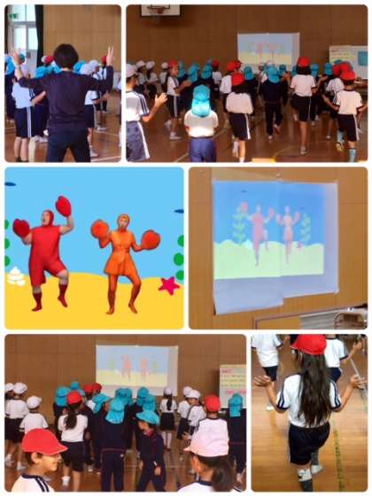 最初に準備運動で「えびかにっくす」をしました。楽しい雰囲気の中で授業が始まりました。