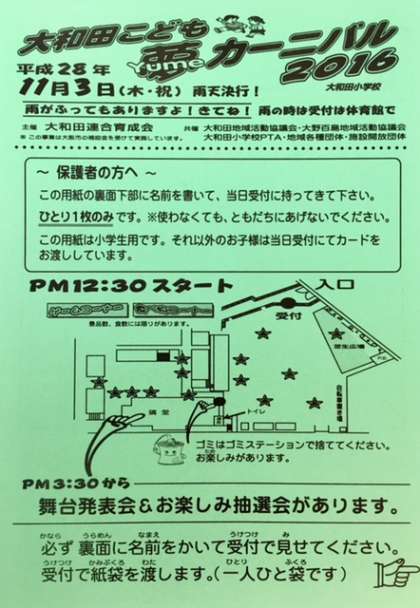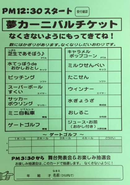 緑のカードは、各ブースの引き換え券になっています。またお楽しみ抽選会の抽選券にもなりますので、必ず学年・組・名前を書いてください。