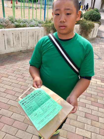 それぞれ、学年・学級別に受付をすまして緑のカードと紙袋をとめてもらいます。