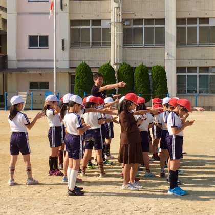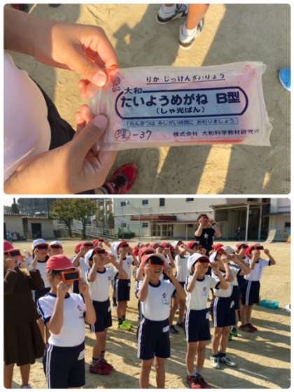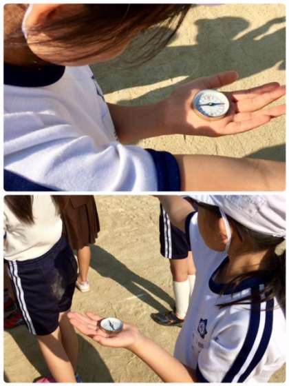 方位磁針で方角を確認し、遮光板を使って太陽の方角を確認しています。