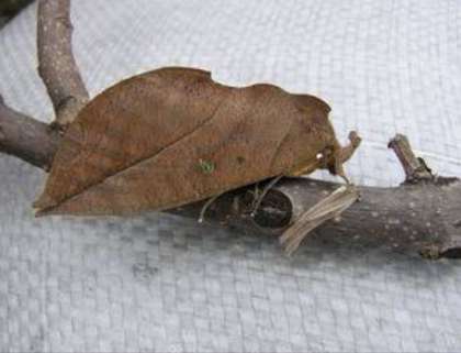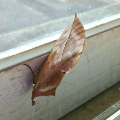 大西先生が、今朝1階トイレ前で見つけられました。パッと見るとまるで落ち葉ですが「アケビコノハ」という蝶の一種だそうです。