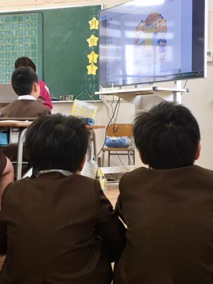 2年2組の読書タイムです。担任の若松先生もICT機器を活用して読み聞かせをしてくださっています。