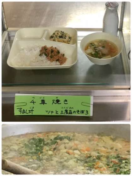 今日の献立は、千草焼、ツナと三度豆のそぼろ、すまし汁、ごはん、牛乳です。