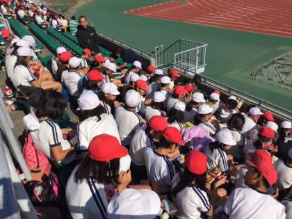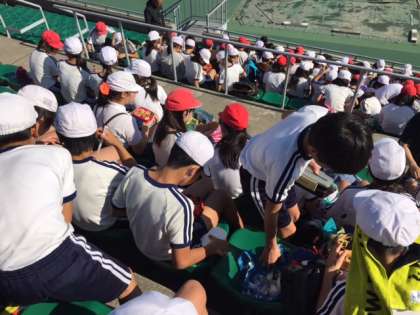 第2陸上競技場に移動して、お昼ごはんです。みんな美味しいお弁当をしっかり食べて、サッカーとドッジボールに備えます。