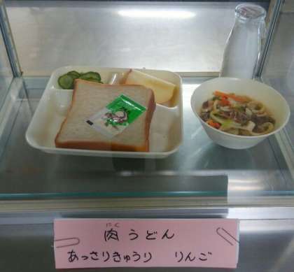 今日の給食は、肉うどん、あっさりきゅうり、食パン、りんご、牛乳です。