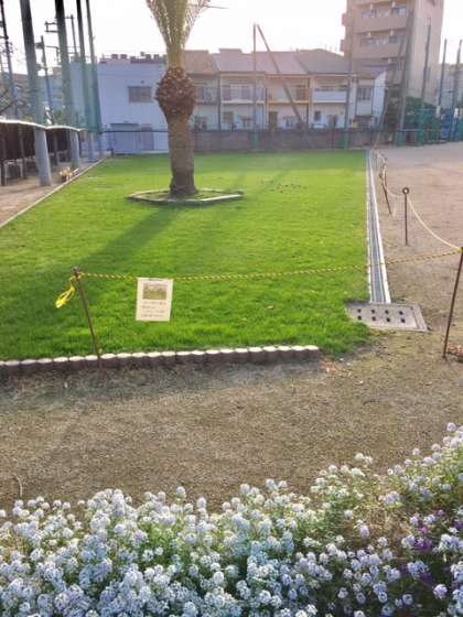 少し冷たい朝です。芝生広場の冬芝が朝の太陽に照らされて光っています。