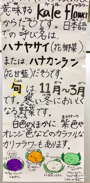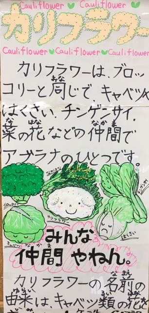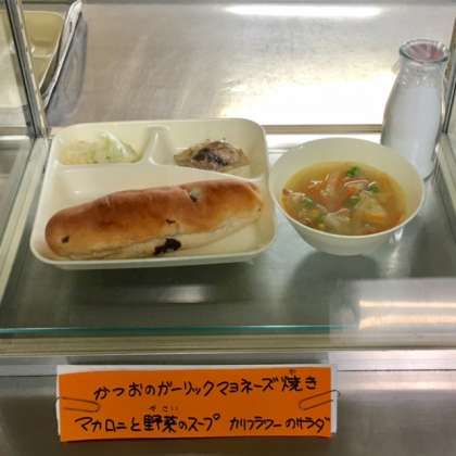 今日の献立は、鰹のガーリックマヨネーズ焼、マカロニと野菜のスープ、カリフラワーのサラダ、レーズンパン、牛乳です。