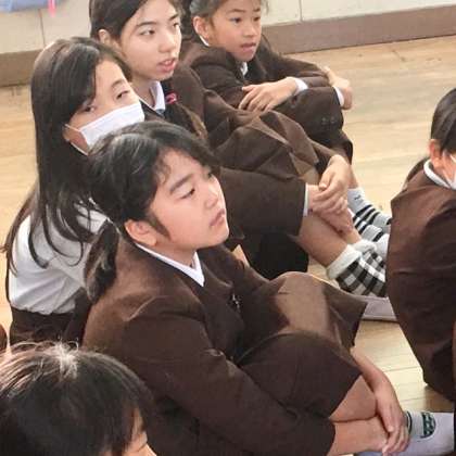 5年2組の読書タイムです。2組も担任の先生の周りに集まって話しを聞いています。
