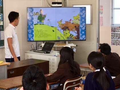 6年2組の読書タイムです。今日は4年生の石倉先生が来てくださいました。ICTを効果的に活用しての読み聞かせです。十二支のお話、お父さん、お母さん、保護者の皆さん、子どもたちからぜひ話しを聞いてください。