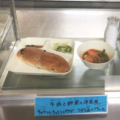 今日の献立は、牛肉と野菜の洋風煮、キャベツとキュウリのサラダ、うずら豆のグラッセ、レーズンパン、牛乳です。