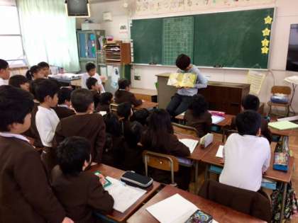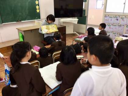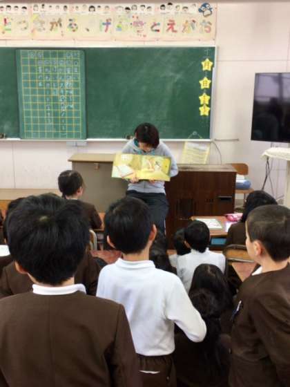 2年2組の読書タイムです。今日は教室の前に集まって担任の若松先生が読み聞かせをしてくださいました。