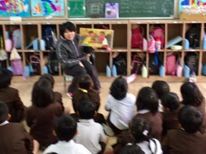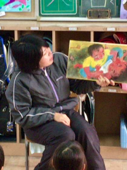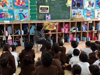 1年2組の様子です。担任の守島先生が絵本の読み聞かせをしてくださっています。