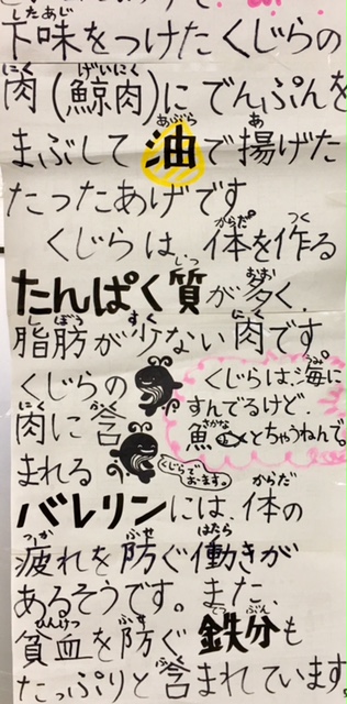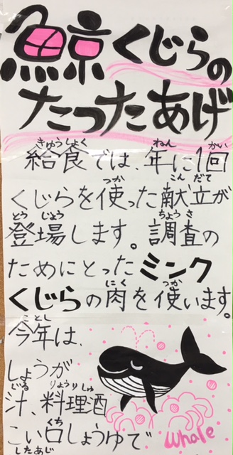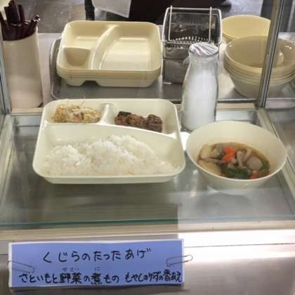 さて、今日の献立は、鯨の竜田揚げ、里芋と野菜の煮物、モヤシの柚子の香和、ごはん、牛乳です。