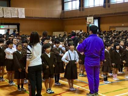 今日は、昨夜の雨で運動場の状態が少し悪いので、講堂で児童朝会を開きました。
