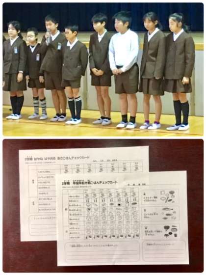 続いて、給食委員さんから「早寝・早起き・朝ご飯週」の話がありました。今日、「2学期 早寝早起き朝ごはんチェックカード」が配付されます。保護者の皆様もご協力よろしくお願いします。